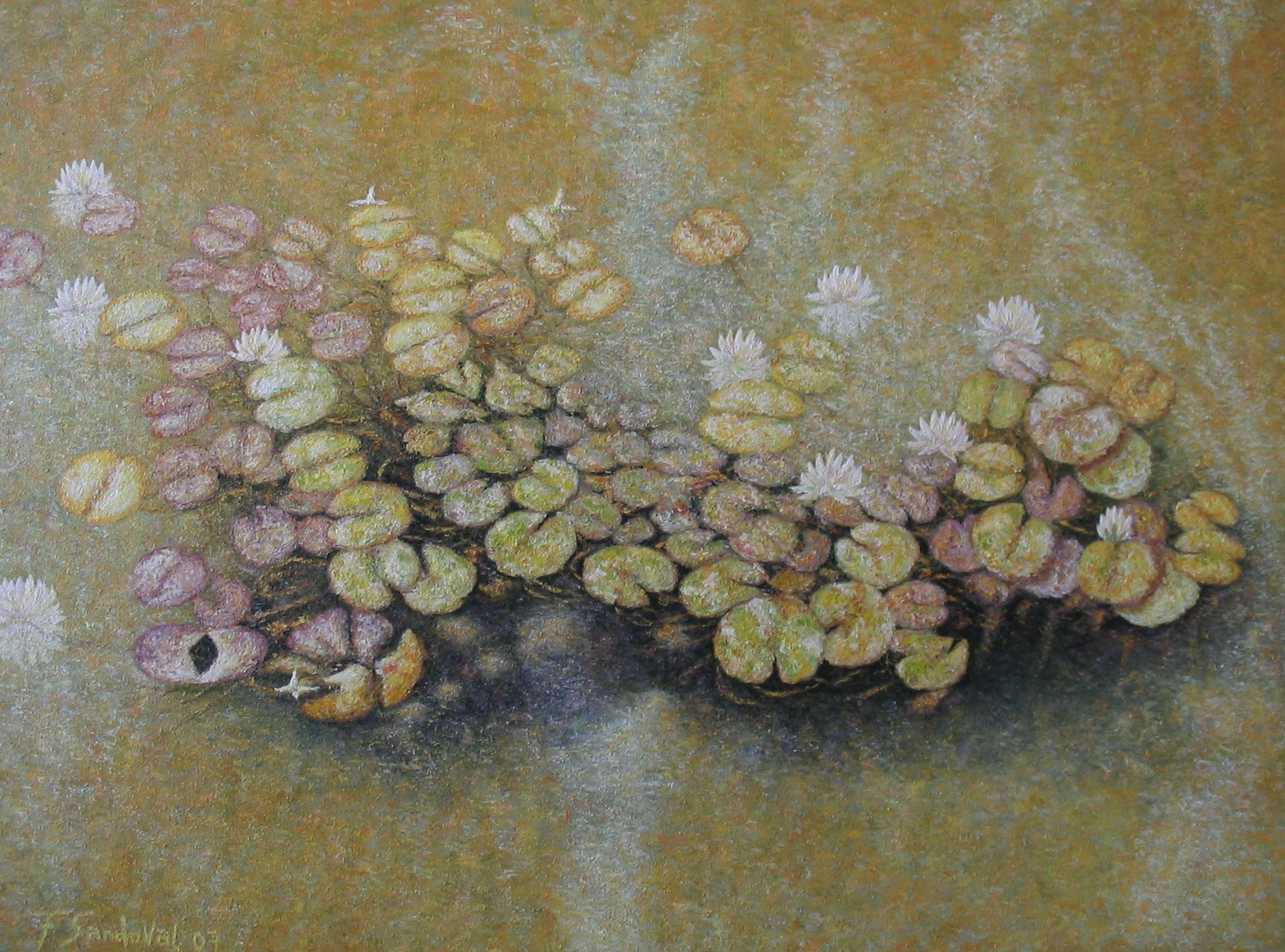 Recreación de unos nenúfares en un estanque con una mezcla de colores verdosos, ocres, amarillos y azulados.